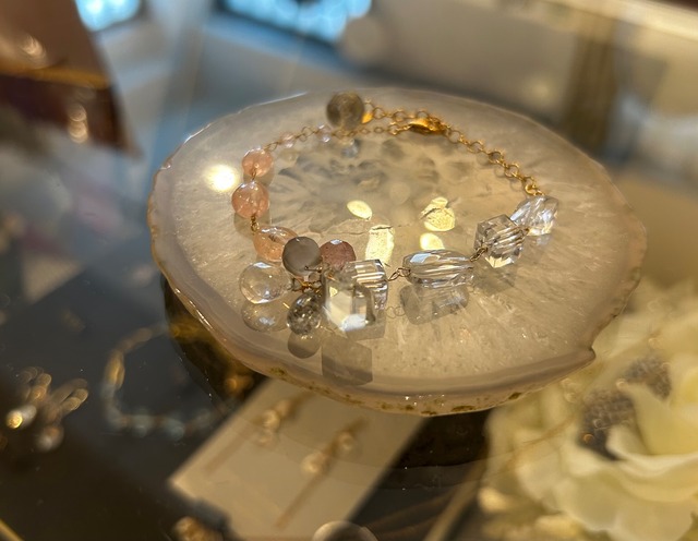 ブーケ部分にモルガナイト・セイロン・クォーツ・ストロベリークォーツ・オーソクレイス・ブルームーンストーンを鏤めました